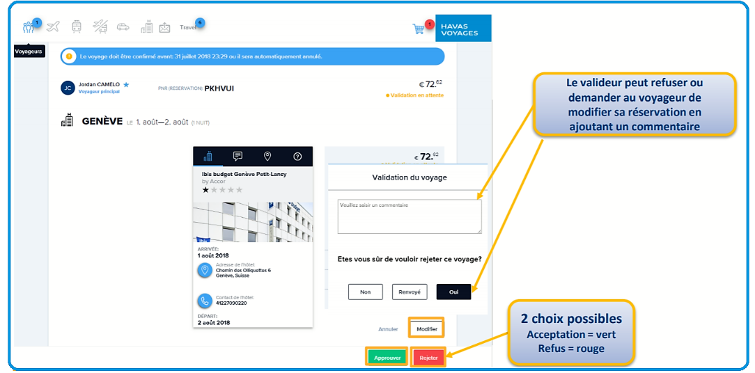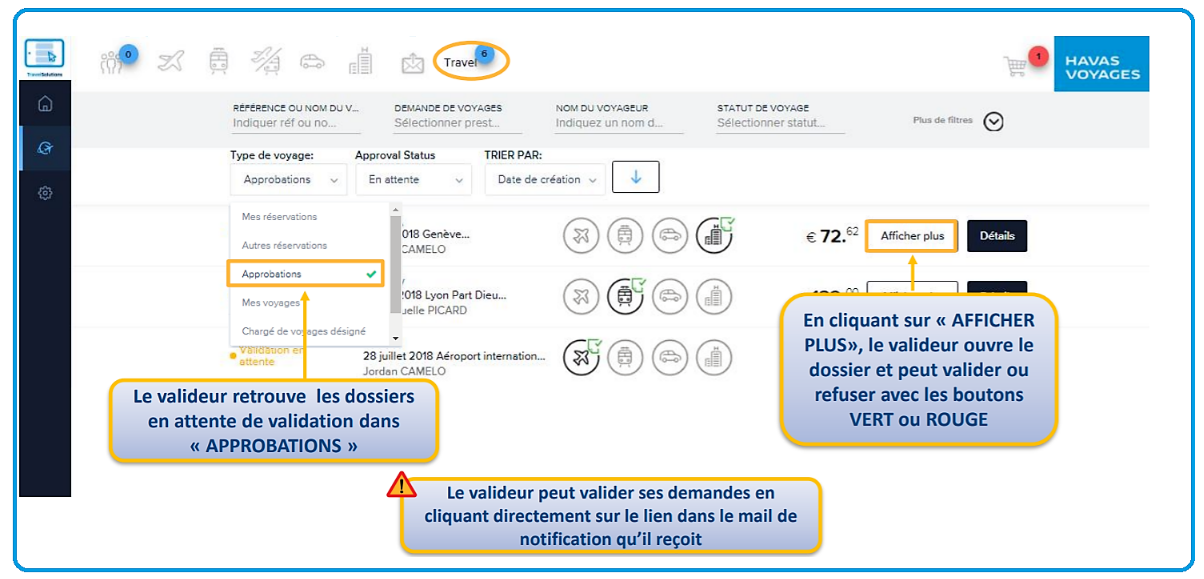 En tant que valideur, des notifications vous sont adressées, vous pouvez depuis ces notifications valider ou refuser le voyage par un simple clic.