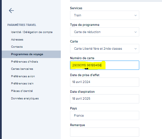 Carte sncf : (Onglet programme de voyage du profil impacté)