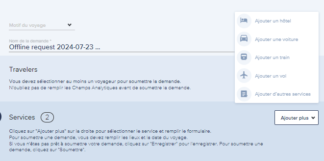 Vous avez la possibilité de commander via votre outil en cliquant sur le formulaire OFFLINE (cf icône de l'enveloppe) différentes prestations non disponibles depuis Travel Solutions :