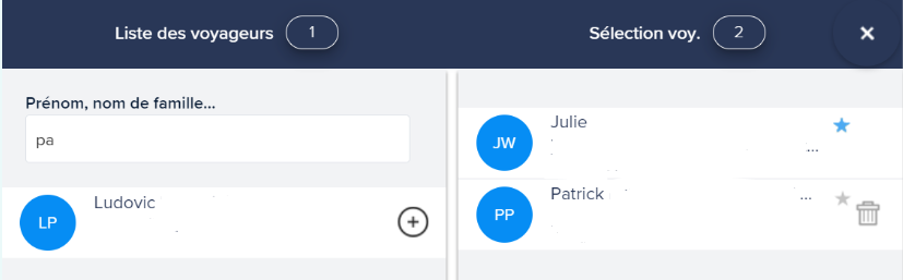 Lorsque je souhaite faire une réservation pour le compte de quelqu’un, j’apparais (Julie dans cet exemple) automatiquement dans les voyageurs sans aucune possibilité de me supprimer.