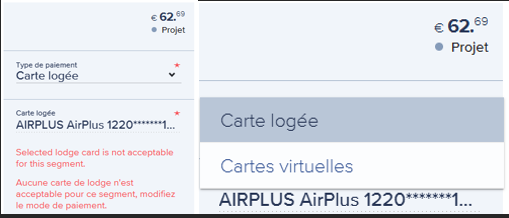 Certaines compagnies lowcost n’acceptent pas l’utilisation des cartes logées => le message en rouge ci-dessous vous alerte.