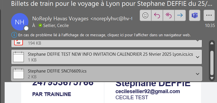 Amélioration des invitations du calendrier pour les réservations ferroviaires SNCF en fournissant des informations supplémentaires. Les voyageurs voient désormais le numéro de référence du train et le numéro de la place sélectionnée inclus dans l'invitation.