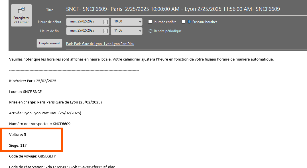 Références SNCF et numéro de siège dans les invitations ICS