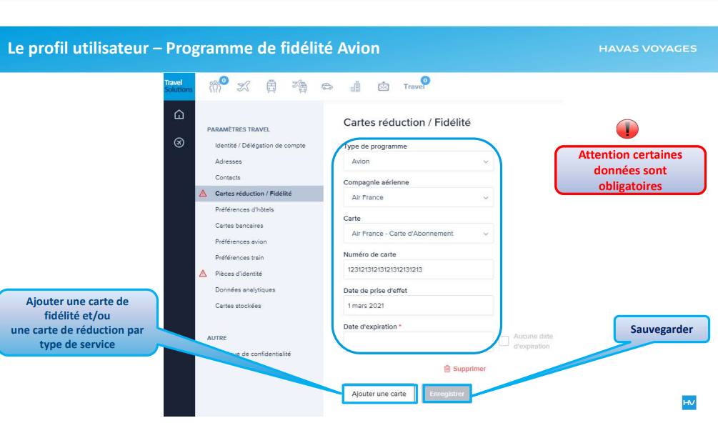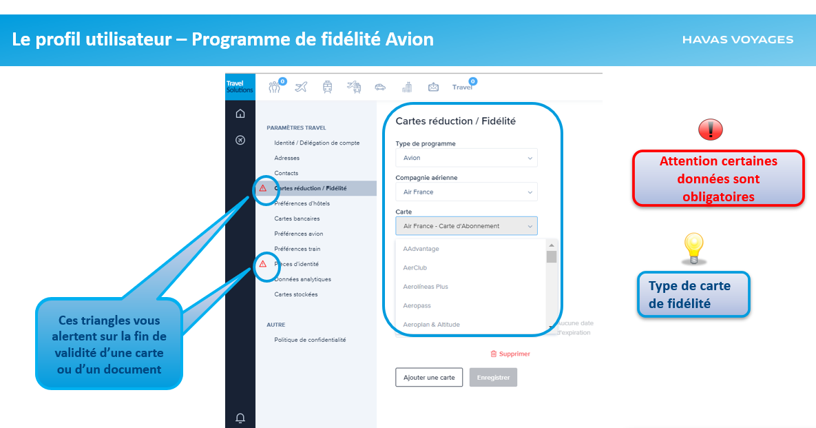 Rubrique "Carte de réduction / fidélité - Avion"