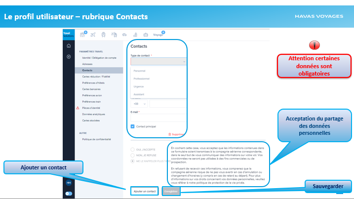 - Type de contact : indiquez la nature du contact (personnel, professionnel, urgence, assistant)